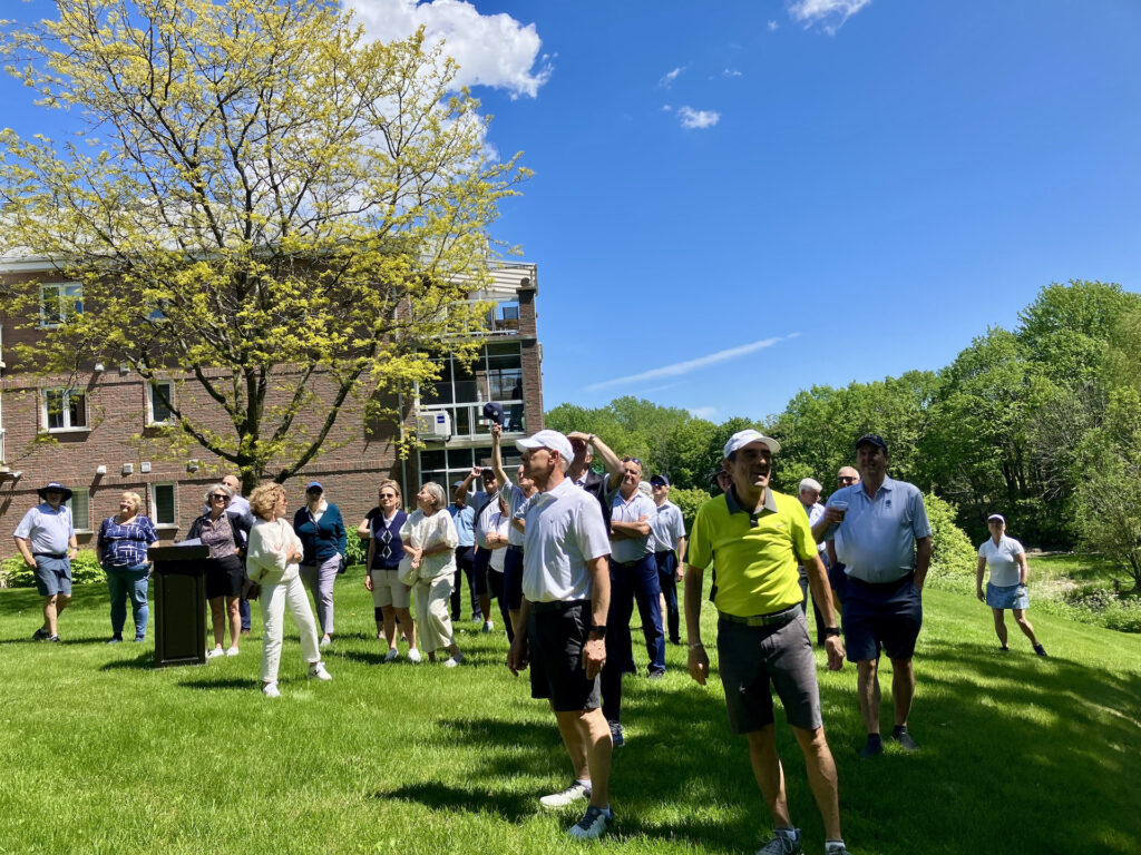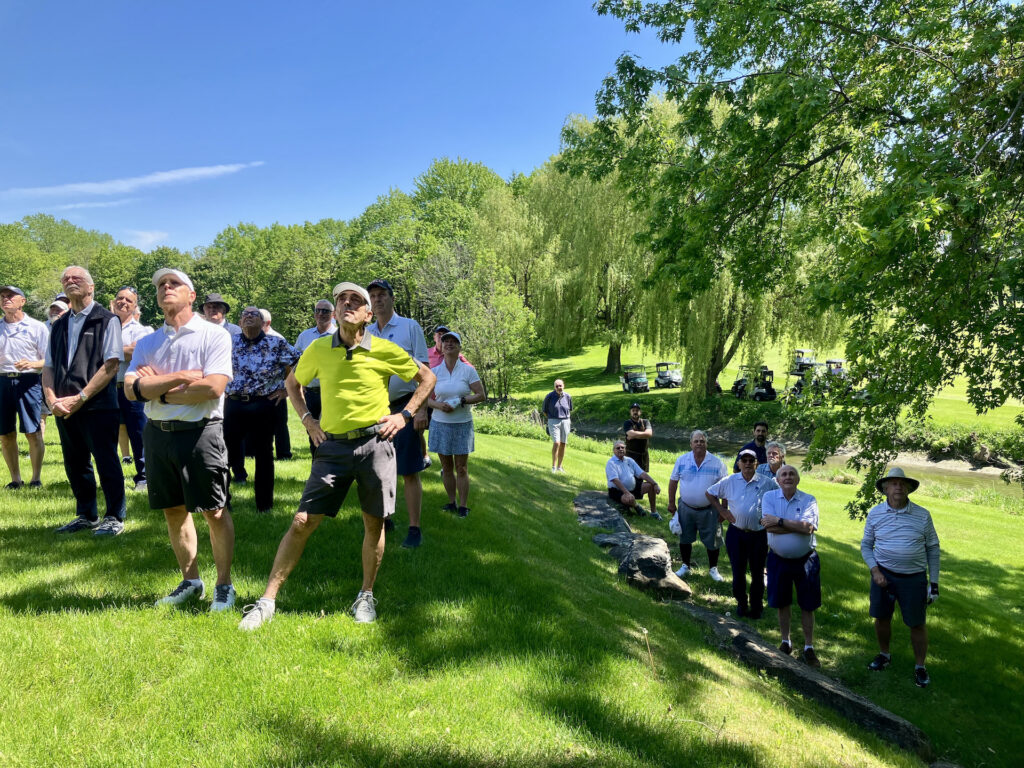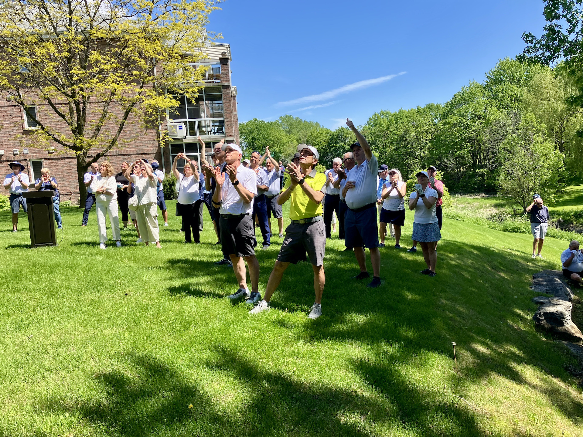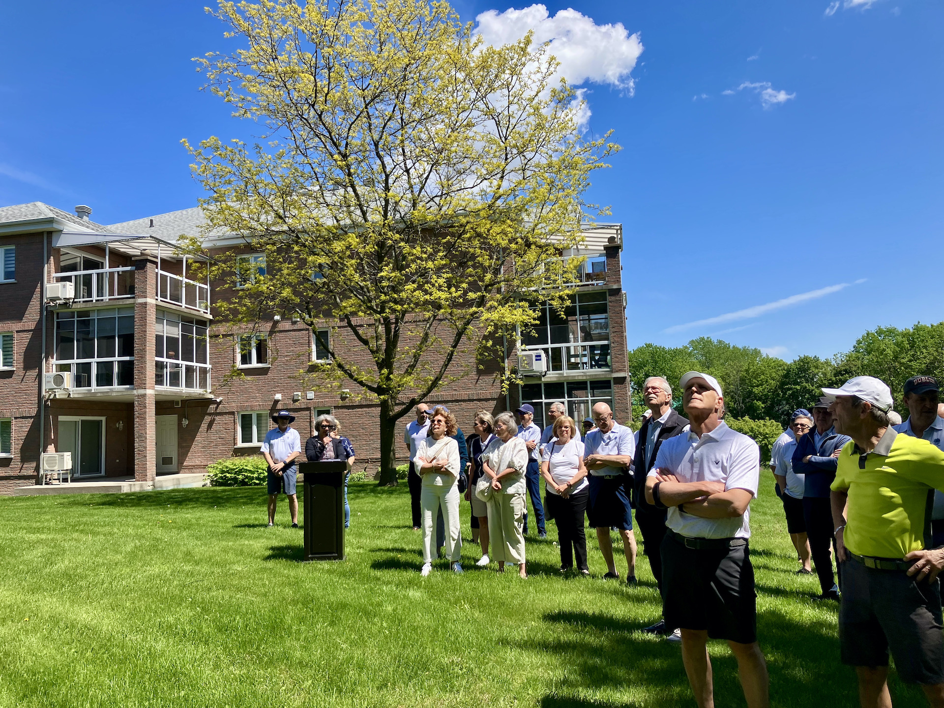 Le paternel, pour qui la saison précédente s’était terminée abruptement et ne pouvait plus espérer en entamer une nouvelle, souhaitait tellement revoir sa gang de « bons vivants » pour les remercier de leur soutien, n’a pas été en mesure de le faire. Je me suis dit, s’il ne peut pas aller au golf, nous allons faire venir le golf à lui! On a donc apporté un lutrin et micro devant le balcon de son condo, qui donnait sur le terrain, et le DG avait planifié des voiturettes pour amener les « bons vivants » afin qu’ils puissent se joindre à ses amis, voisins et employés du club pour lui livrer de vibrants témoignages. Mon papa a trouvé la force de se lever et de prononcer un discours, à son tour, qui s’est terminée sous une pluie d’applaudissements, de pouce en l’air et de : « on t’aime, on t’oubliera jamais! ».
